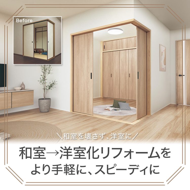 すぐに導入できる商品を使えば、和室を壊さず、短期間で洋室に変身!まずは「フスマート」「和室リフォーム折れ戸」「アイシェルフ」「ウスイータ」をチェック!