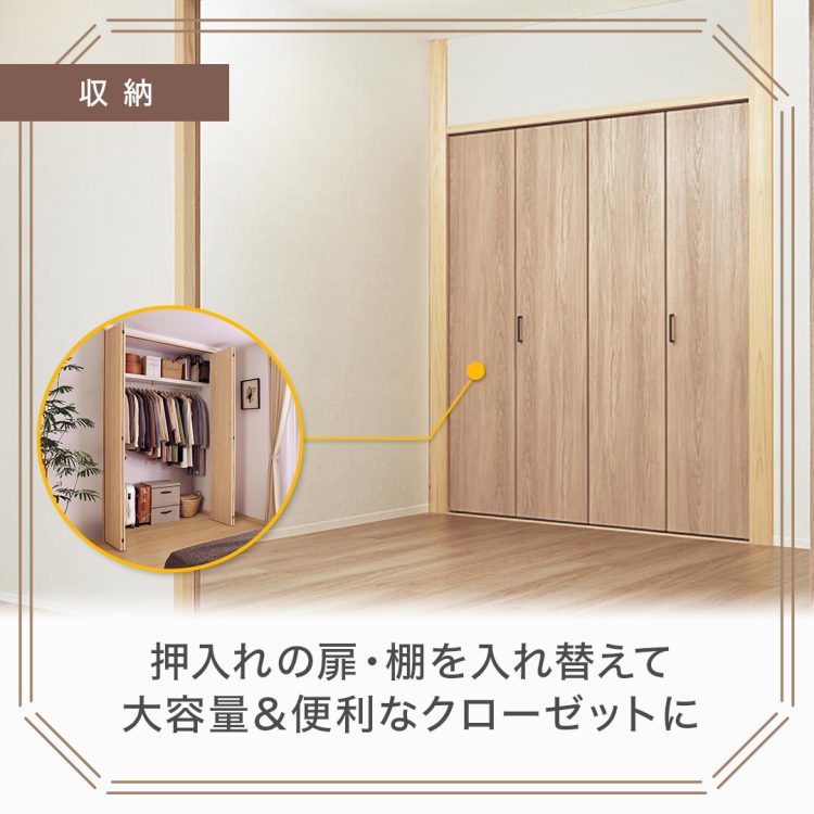 押入れは扉を替えるだけで簡単にクローゼット化可能。「和室リフォーム折れ戸」は鴨居・敷居を活かして省施工で設置できます。